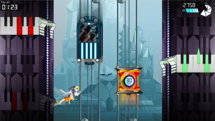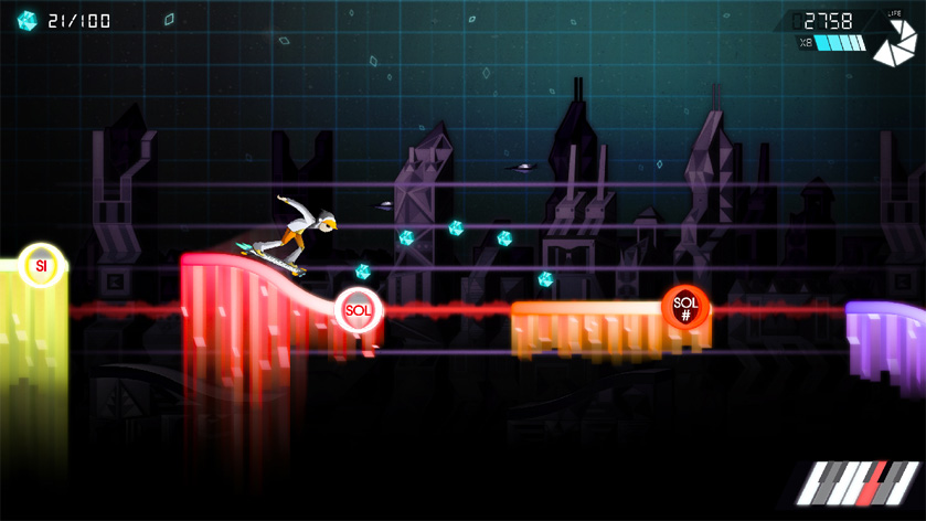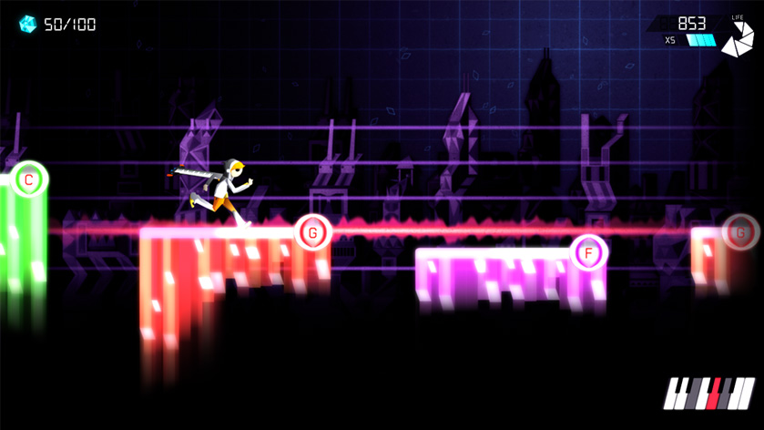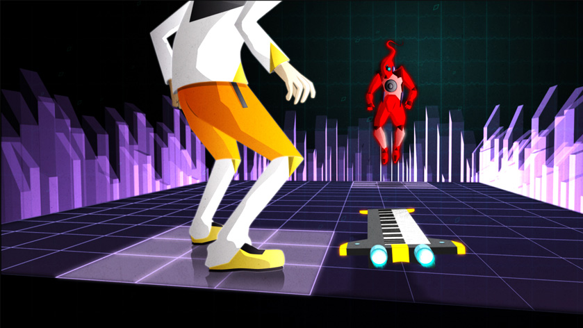 The entire univers of the game is a tribute to the flashy and neon athmosphere of the 80's electronic music. Actually the entire story is taking place into the inner part of a Mini Moog Syntheziser.